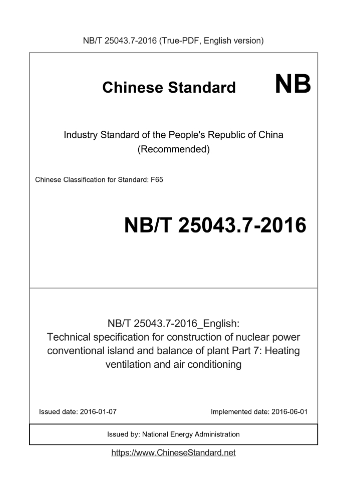 Delivery: <= 7 days. True-PDF full-copy in English will be manually translated and delivered via email. NB/T 25043.7-2016: Technical specification for construction of nuclear power conventional island and balance of plant Part 7: Heating ventilation and air conditioning Status: Valid
