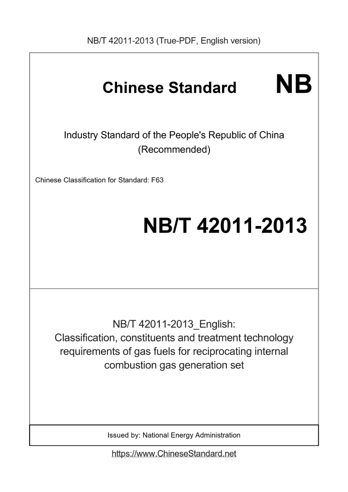 Delivery: <= 3 days. True-PDF full-copy in English will be manually translated and delivered via email. NB/T 42011-2013: Classification, constituents and treatment technology requirements of gas fuels for reciprocating internal combustion gas generation set Status: Valid