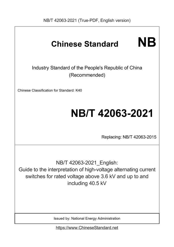 Delivery: <= 3 days. True-PDF full-copy in English will be manually translated and delivered via email. NB/T 42063-2021: Guide to the interpretation of high-voltage alternating current switches for rated voltage above 3.6 kV and up to and including 40.5 kV Status: Valid NB/T 42063: Historical versions