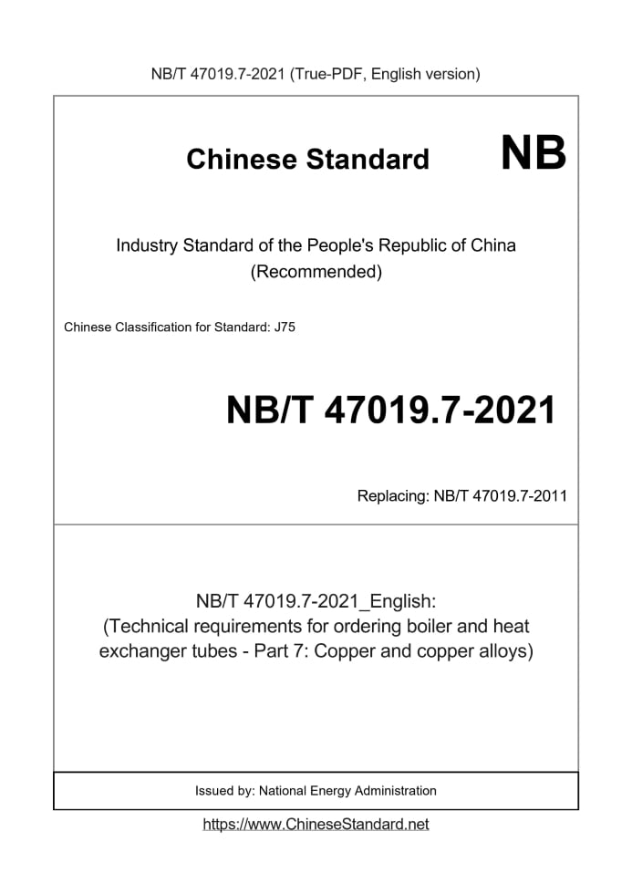 Delivery: <= 3 days. True-PDF full-copy in English will be manually translated and delivered via email. NB/T 47019.7-2021: (Technical requirements for ordering boiler and heat exchanger tubes - Part 7: Copper and copper alloys) Status: Valid NB/T 47019.7: Historical versions