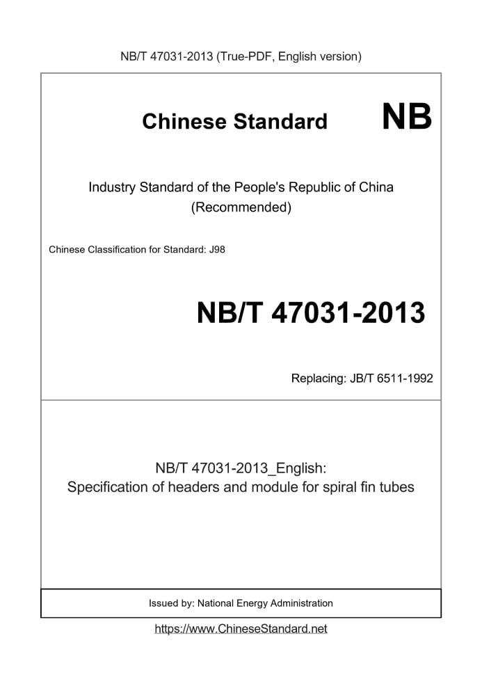 Delivery: <= 3 days. True-PDF full-copy in English will be manually translated and delivered via email. NB/T 47031-2013: Specification of headers and module for spiral fin tubes Status: Valid