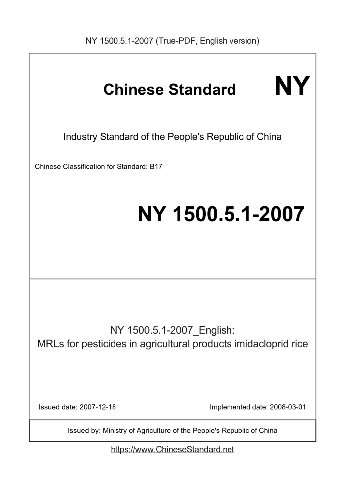 Basic dataStandard ID: NY 1500.5.1-2007 (NY1500.5.1-2007)Description (Translated English): MRLs for pesticides in agricultural products imidacloprid rice Sector / Industry: Agriculture Industry Standard Classification of Chinese Standard: B17 Classification of International Standard: 65.020 Word Count Estimation: 4,450 Date of Issue: 2007-12-18 Date of Implementation: 2008-03-01 Regulation (derived from): Ministry of Agriculture Bulletin No. 952; Ministry of Agriculture Bulletin No. 1859 Issuing agency(ies): Ministry of Agriculture of the People's Republic of China Summary: This standard specifies the avermectin and other 30 kinds of pesticides in agricultural products, MRLs. This standard applies to pesticides listed in Table 14 corresponding agricultural products. Tips & Frequently Asked Questions:Question 1: How long will the true-PDF of NY 1500.5.1-2007_English be delivered?Answer: Upon your order, we will start to translate NY 1500.5.1-2007_English as soon as possible, and keep you informed of the progress. The lead time is typically in 9 seconds (download/delivered in 9 seconds). The lengthier the document the longer the lead time.Question 2: Can I share the purchased PDF of NY 1500.5.1-2007_English with my colleagues?Answer: Yes. The purchased PDF of NY 1500.5.1-2007_English will be deemed to be sold to your employer/organization who actually pays for it, including your colleagues and your employer's intranet.Question 3: Does the price include tax/VAT?Answer: Yes. Our tax invoice, downloaded/delivered in 9 seconds, includes all tax/VAT and complies with 100+ countries' tax regulations (tax exempted in 100+ countries) -- See Avoidance of Double Taxation Agreements (DTAs): List of DTAs signed between Singapore and 100+ countriesQuestion 4: Do you accept my currency other than USD?Answer: Yes. If you need your currency to be printed on the invoice, please write an email to Sales@ChineseStandard.net. In 2 working-hours, we will create a special link for you to pay in any currencies. Otherwise, follow the normal steps: Add to Cart -- Checkout -- Select your currency to pay. |