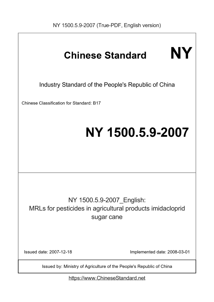 Basic dataStandard ID: NY 1500.5.9-2007 (NY1500.5.9-2007)Description (Translated English): MRLs for pesticides in agricultural products imidacloprid sugar cane Sector / Industry: Agriculture Industry Standard Classification of Chinese Standard: B17 Classification of International Standard: 65.020 Word Count Estimation: 4,445 Date of Issue: 2007-12-18 Date of Implementation: 2008-03-01 Regulation (derived from): Ministry of Agriculture Bulletin No. 952; Ministry of Agriculture Bulletin No. 1859 Issuing agency(ies): Ministry of Agriculture of the People's Republic of China Summary: This standard specifies the avermectin and other 30 kinds of pesticides in agricultural products, MRLs. This standard applies to pesticides listed in Table 22 corresponding agricultural products. Tips & Frequently Asked Questions:Question 1: How long will the true-PDF of NY 1500.5.9-2007_English be delivered?Answer: Upon your order, we will start to translate NY 1500.5.9-2007_English as soon as possible, and keep you informed of the progress. The lead time is typically in 9 seconds (download/delivered in 9 seconds). The lengthier the document the longer the lead time.Question 2: Can I share the purchased PDF of NY 1500.5.9-2007_English with my colleagues?Answer: Yes. The purchased PDF of NY 1500.5.9-2007_English will be deemed to be sold to your employer/organization who actually pays for it, including your colleagues and your employer's intranet.Question 3: Does the price include tax/VAT?Answer: Yes. Our tax invoice, downloaded/delivered in 9 seconds, includes all tax/VAT and complies with 100+ countries' tax regulations (tax exempted in 100+ countries) -- See Avoidance of Double Taxation Agreements (DTAs): List of DTAs signed between Singapore and 100+ countriesQuestion 4: Do you accept my currency other than USD?Answer: Yes. If you need your currency to be printed on the invoice, please write an email to Sales@ChineseStandard.net. In 2 working-hours, we will create a special link for you to pay in any currencies. Otherwise, follow the normal steps: Add to Cart -- Checkout -- Select your currency to pay. |