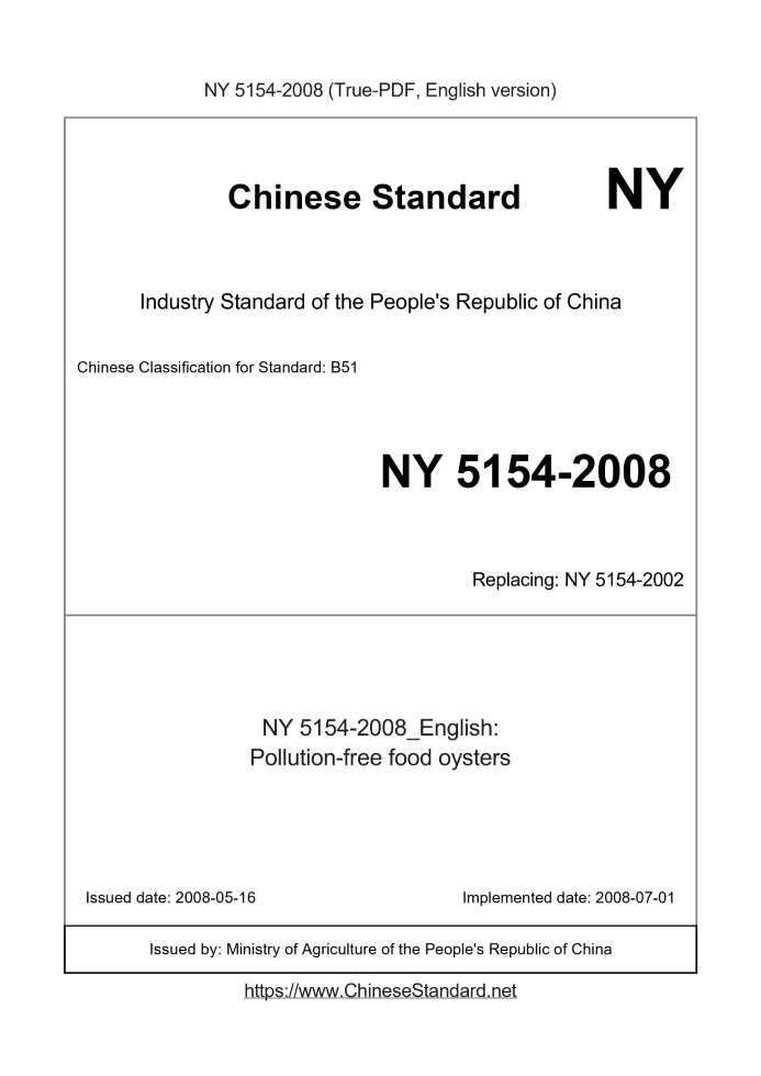 Basic dataStandard ID: NY 5154-2008 (NY5154-2008)Description (Translated English): Pollution-free food oysters Sector / Industry: Agriculture Industry Standard Classification of Chinese Standard: B51 Classification of International Standard: 67.120.30 Word Count Estimation: 6,657 Date of Issue: 2008-05-16 Date of Implementation: 2008-07-01 Older Standard (superseded by this standard): NY 5154-2002 Quoted Standard: GB/T 4789.4; GB/T 4789.6; GB/T 5009.11; GB/T 5009.12; GB/T 5009.15; GB/T 5009.17; GB/T 5009.190; GB 17378.6; NY 5052; SC/T 3016-2004; SC/T 3023; SC/T 3024 Regulation (derived from): Ministry of Agriculture Bulletin 1033; Ministry of Agriculture Bulletin No. 1963 Issuing agency(ies): Ministry of Agriculture of the People's Republic of China Summary: This standard specifies requirements for pollution-free food oysters, test methods, inspection rules, marking, packaging, transport and storage. This standard applies to Crassostrea (Crassostrea rivularis), pleated oyster (Ostrea plicatula), Pacific oyster (Crassostrea gigas) in vivo and shellfish meat. Other in vivo oyster and shellfish meat may refer to. Tips & Frequently Asked Questions:Question 1: How long will the true-PDF of NY 5154-2008_English be delivered?Answer: Upon your order, we will start to translate NY 5154-2008_English as soon as possible, and keep you informed of the progress. The lead time is typically in 9 seconds (download/delivered in 9 seconds). The lengthier the document the longer the lead time.Question 2: Can I share the purchased PDF of NY 5154-2008_English with my colleagues?Answer: Yes. The purchased PDF of NY 5154-2008_English will be deemed to be sold to your employer/organization who actually pays for it, including your colleagues and your employer's intranet.Question 3: Does the price include tax/VAT?Answer: Yes. Our tax invoice, downloaded/delivered in 9 seconds, includes all tax/VAT and complies with 100+ countries' tax regulations (tax exempted in 100+ countries) -- See Avoidance of Double Taxation Agreements (DTAs): List of DTAs signed between Singapore and 100+ countriesQuestion 4: Do you accept my currency other than USD?Answer: Yes. If you need your currency to be printed on the invoice, please write an email to Sales@ChineseStandard.net. In 2 working-hours, we will create a special link for you to pay in any currencies. Otherwise, follow the normal steps: Add to Cart -- Checkout -- Select your currency to pay.Question 5: Should I purchase the latest version NY 5154-2008?Answer: Yes. Unless special scenarios such as technical constraints or academic study, you should always prioritize to purchase the latest version NY 5154-2008 even if the enforcement date is in future. Complying with the latest version means that, by default, it also complies with all the earlier versions, technically. |