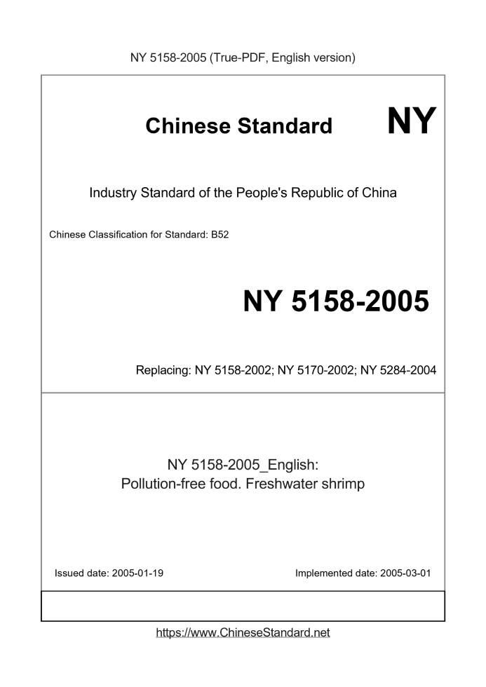 | NY 5158-2005 English PDFUS$239.00 ยท In stock Delivery: <= 2 days. True-PDF full-copy in English will be manually translated and delivered via email. NY 5158-2005: Pollution-free food. Freshwater shrimp Status: Obsolete NY 5158: Historical versions