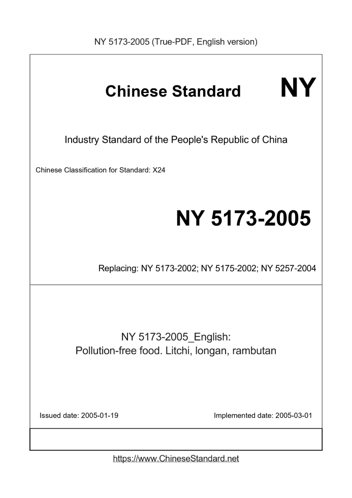 | NY 5173-2005 English PDFUS$239.00 ยท In stock Delivery: <= 2 days. True-PDF full-copy in English will be manually translated and delivered via email. NY 5173-2005: Pollution-free food. Litchi, longan, rambutan Status: Obsolete NY 5173: Historical versions