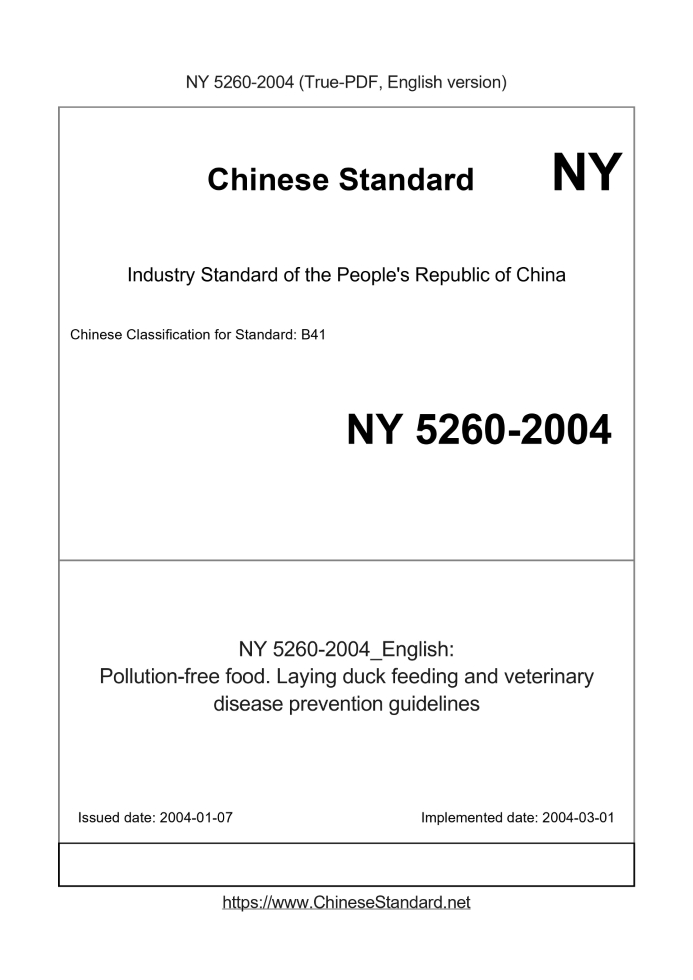 Delivery: <= 2 days. True-PDF full-copy in English will be manually translated and delivered via email. NY 5260-2004: Pollution-free food. Laying duck feeding and veterinary disease prevention guidelines Status: Valid