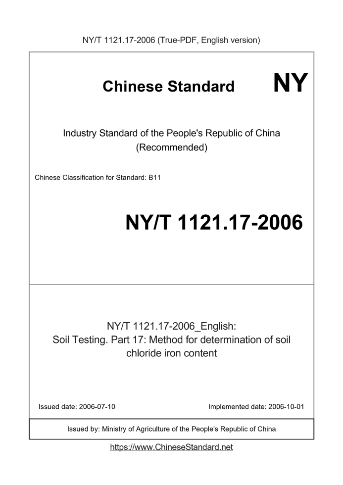 | NY/T 1121.17-2006 English PDFUS$179.00 ยท In stock Delivery: <= 2 days. True-PDF full-copy in English will be manually translated and delivered via email. NY/T 1121.17-2006: Soil Testing. Part 17: Method for determination of soil chloride iron content