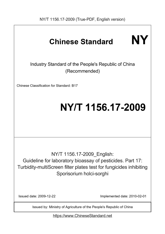 | NY/T 1156.17-2009 English PDFUS$149.00 ยท In stock Delivery: <= 2 days. True-PDF full-copy in English will be manually translated and delivered via email. NY/T 1156.17-2009: Guideline for laboratory bioassay of pesticides. Part 17: Turbidity-multiScreen filter plates test for fungicides inhibiting Sporisorium holci-sorghi Status: Valid