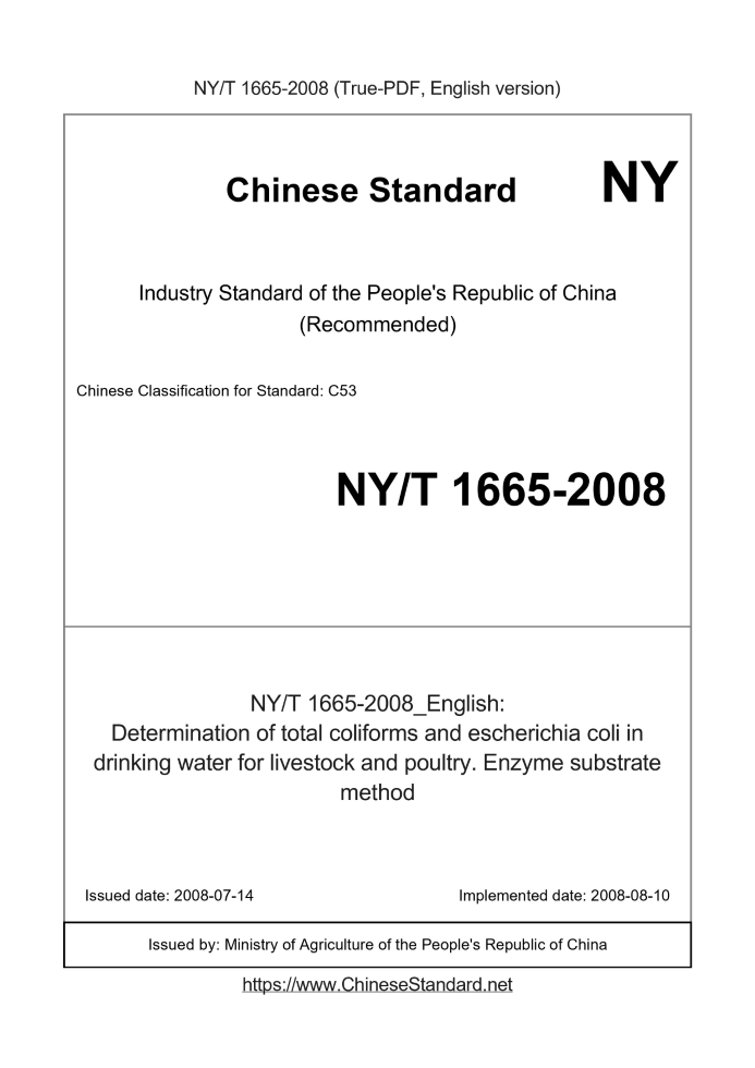 Delivery: <= 3 days. True-PDF full-copy in English will be manually translated and delivered via email. NY/T 1665-2008: Determination of total coliforms and escherichia coli in drinking water for livestock and poultry. Enzyme substrate method Status: Valid