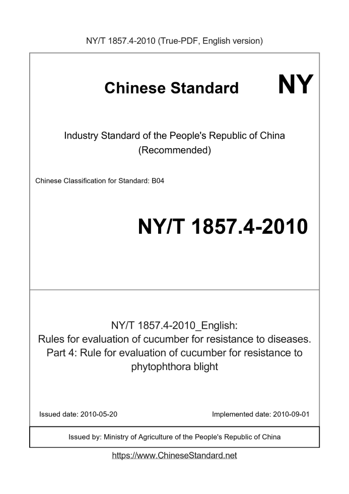 Delivery: <= 3 days. True-PDF full-copy in English will be manually translated and delivered via email. NY/T 1857.4-2010: Rules for evaluation of cucumber for resistance to diseases. Part 4: Rule for evaluation of cucumber for resistance to phytophthora blight Status: Valid