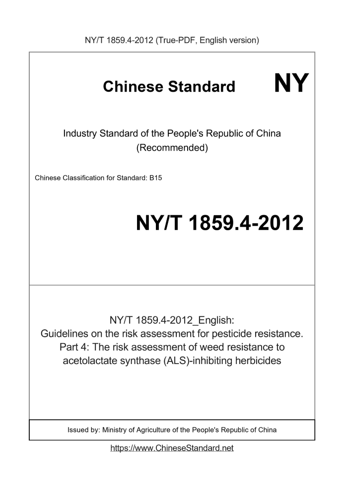 Delivery: <= 3 days. True-PDF full-copy in English will be manually translated and delivered via email. NY/T 1859.4-2012: Guidelines on the risk assessment for pesticide resistance. Part 4: The risk assessment of weed resistance to acetolactate synthase (ALS)-inhibiting herbicides Status: Valid