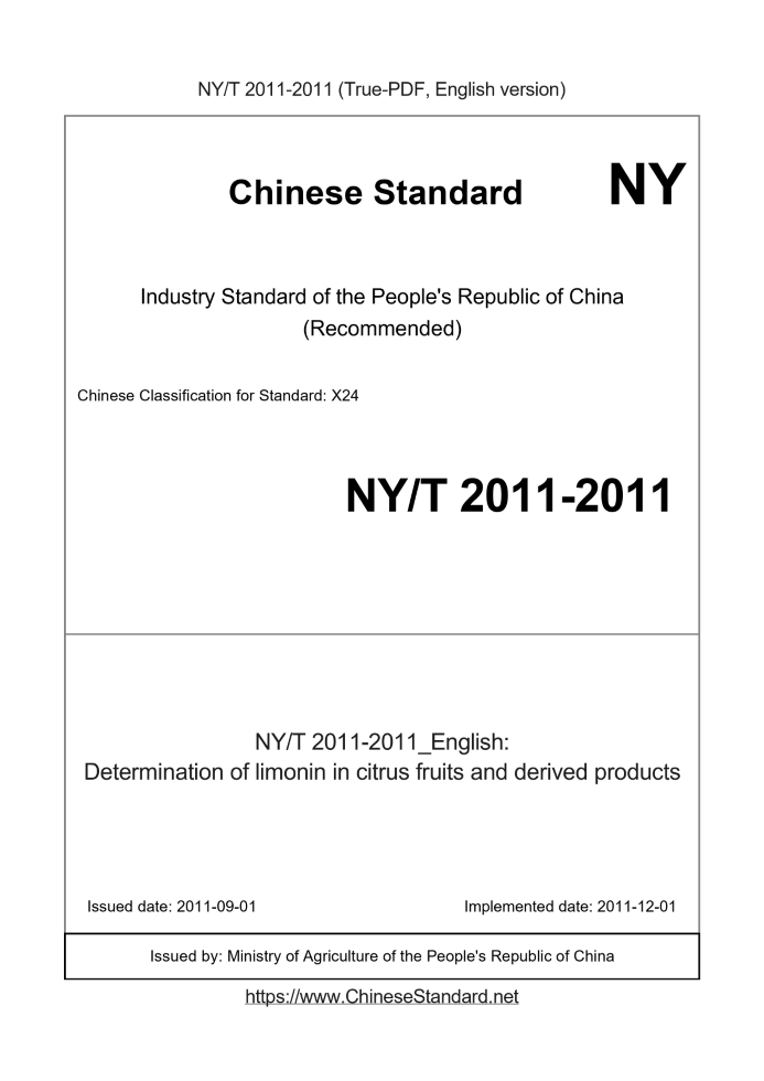 Delivery: <= 3 days. True-PDF full-copy in English will be manually translated and delivered via email. NY/T 2011-2011: Determination of limonin in citrus fruits and derived products Status: Valid