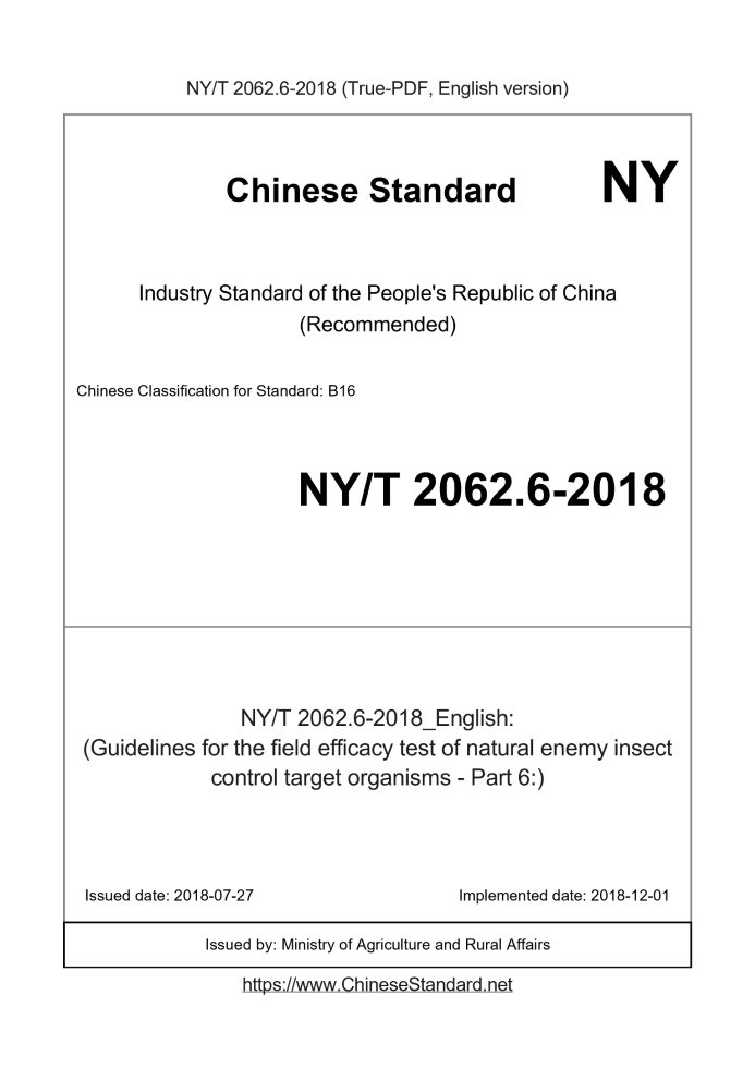 Delivery: <= 3 days. True-PDF full-copy in English will be manually translated and delivered via email. NY/T 2062.6-2018: (Guidelines for the field efficacy test of natural enemy insect control target organisms - Part 6:) Status: Valid