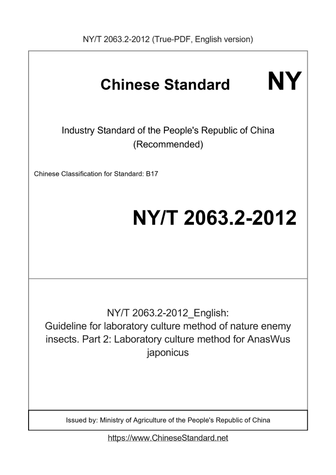 Delivery: <= 3 days. True-PDF full-copy in English will be manually translated and delivered via email. NY/T 2063.2-2012: Guideline for laboratory culture method of nature enemy insects. Part 2: Laboratory culture method for AnasWus japonicus Status: Valid