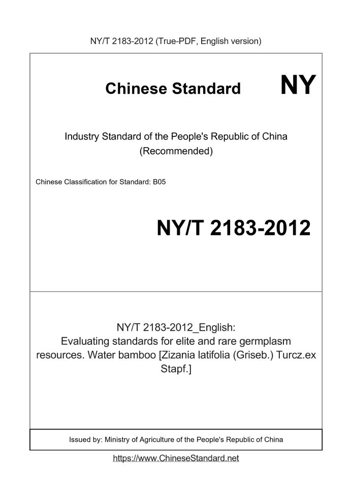 Delivery: <= 3 days. True-PDF full-copy in English will be manually translated and delivered via email. NY/T 2183-2012: Evaluating standards for elite and rare germplasm resources. Water bamboo [Zizania latifolia (Griseb.) Turcz.ex Stapf.] Status: Valid