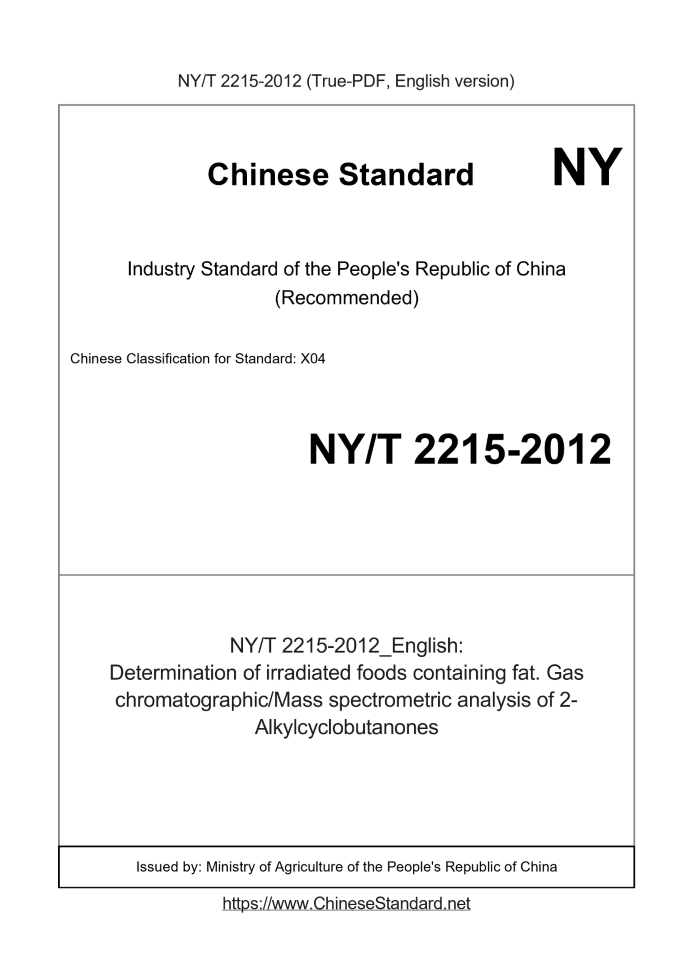 Delivery: <= 3 days. True-PDF full-copy in English will be manually translated and delivered via email. NY/T 2215-2012: Determination of irradiated foods containing fat. Gas chromatographic/Mass spectrometric analysis of 2-Alkylcyclobutanones Status: Valid