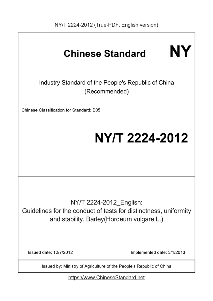 Delivery: <= 5 days. True-PDF full-copy in English will be manually translated and delivered via email. NY/T 2224-2012: Guidelines for the conduct of tests for distinctness, uniformity and stability. Barley(Hordeum vulgare L.) Status: Valid