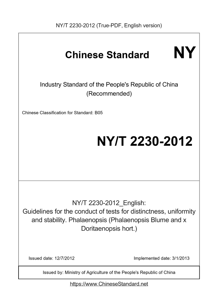 Delivery: <= 5 days. True-PDF full-copy in English will be manually translated and delivered via email. NY/T 2230-2012: Guidelines for the conduct of tests for distinctness, uniformity and stability. Phalaenopsis (Phalaenopsis Blume and x Doritaenopsis hort.) Status: Valid