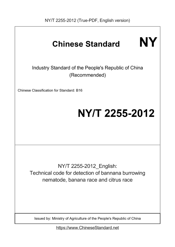 Delivery: <= 3 days. True-PDF full-copy in English will be manually translated and delivered via email. NY/T 2255-2012: Technical code for detection of bannana burrowing nematode, banana race and citrus race Status: Valid