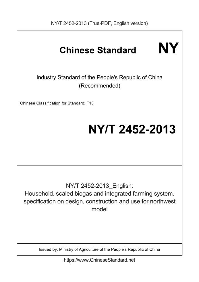Delivery: <= 3 days. True-PDF full-copy in English will be manually translated and delivered via email. NY/T 2452-2013: Household. scaled biogas and integrated farming system. specification on design, construction and use for northwest model Status: Valid