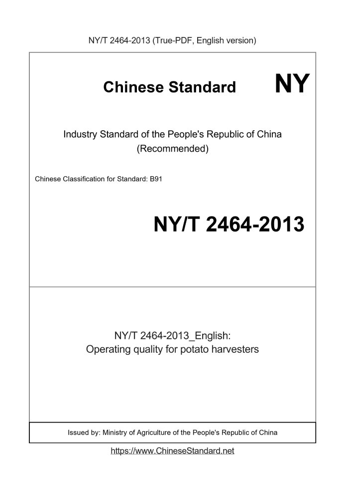 Delivery: <= 3 days. True-PDF full-copy in English will be manually translated and delivered via email. NY/T 2464-2013: Operating quality for potato harvesters Status: Valid