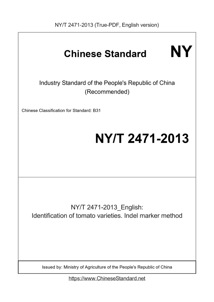Delivery: <= 4 days. True-PDF full-copy in English will be manually translated and delivered via email. NY/T 2471-2013: Identification of tomato varieties. Indel marker method Status: Valid