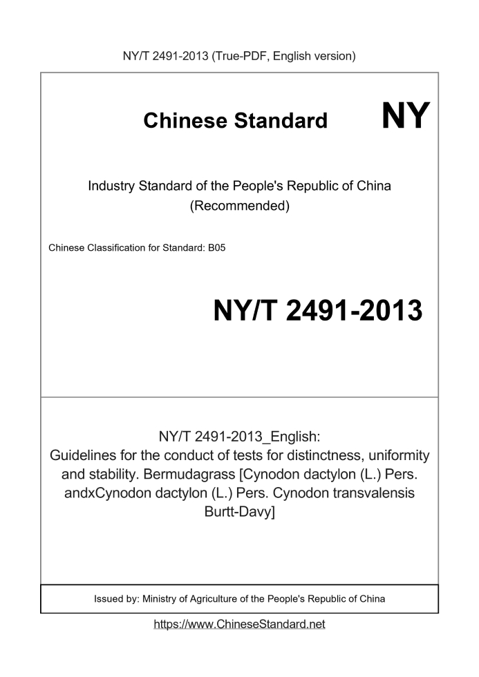 Delivery: <= 3 days. True-PDF full-copy in English will be manually translated and delivered via email. NY/T 2491-2013: Guidelines for the conduct of tests for distinctness, uniformity and stability. Bermudagrass [Cynodon dactylon (L.) Pers. andxCynodon dactylon (L.) Pers. Cynodon transvalensis Burtt-Davy] Status: Valid