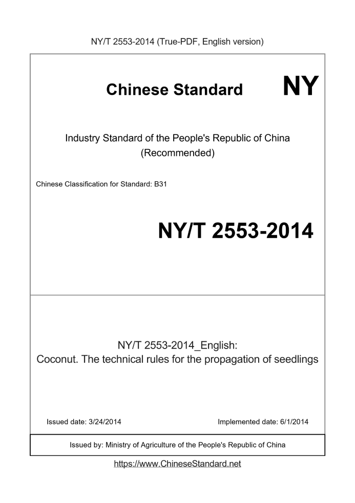 Delivery: <= 3 days. True-PDF full-copy in English will be manually translated and delivered via email. NY/T 2553-2014: Coconut. The technical rules for the propagation of seedlings Status: Valid
