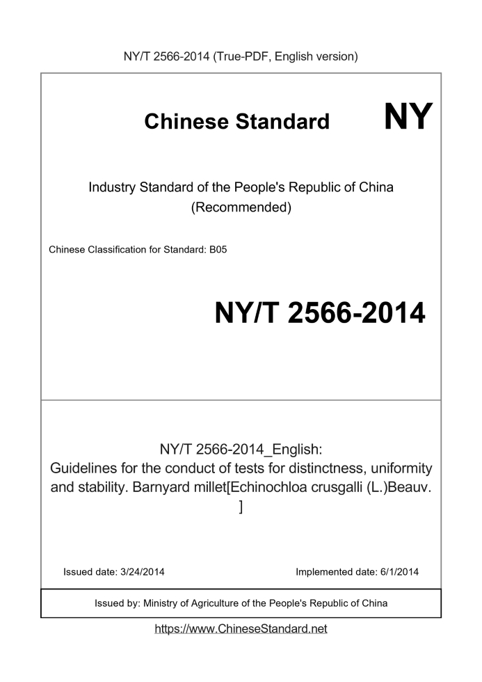 Delivery: <= 4 days. True-PDF full-copy in English will be manually translated and delivered via email. NY/T 2566-2014: Guidelines for the conduct of tests for distinctness, uniformity and stability. Barnyard millet[Echinochloa crusgalli (L.)Beauv. ] Status: Valid