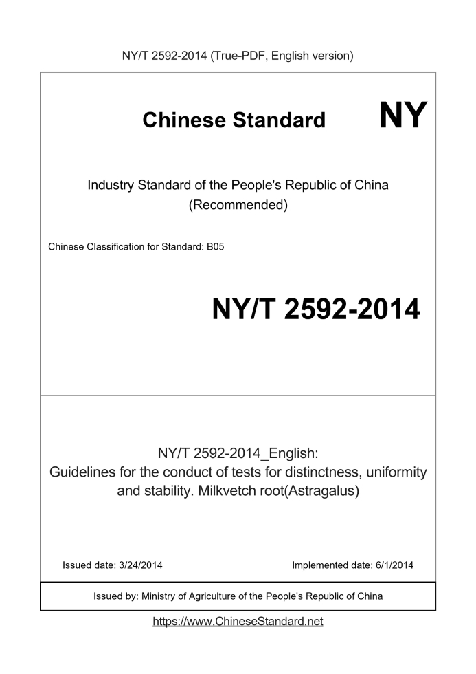 Delivery: <= 3 days. True-PDF full-copy in English will be manually translated and delivered via email. NY/T 2592-2014: Guidelines for the conduct of tests for distinctness, uniformity and stability. Milkvetch root(Astragalus) Status: Valid