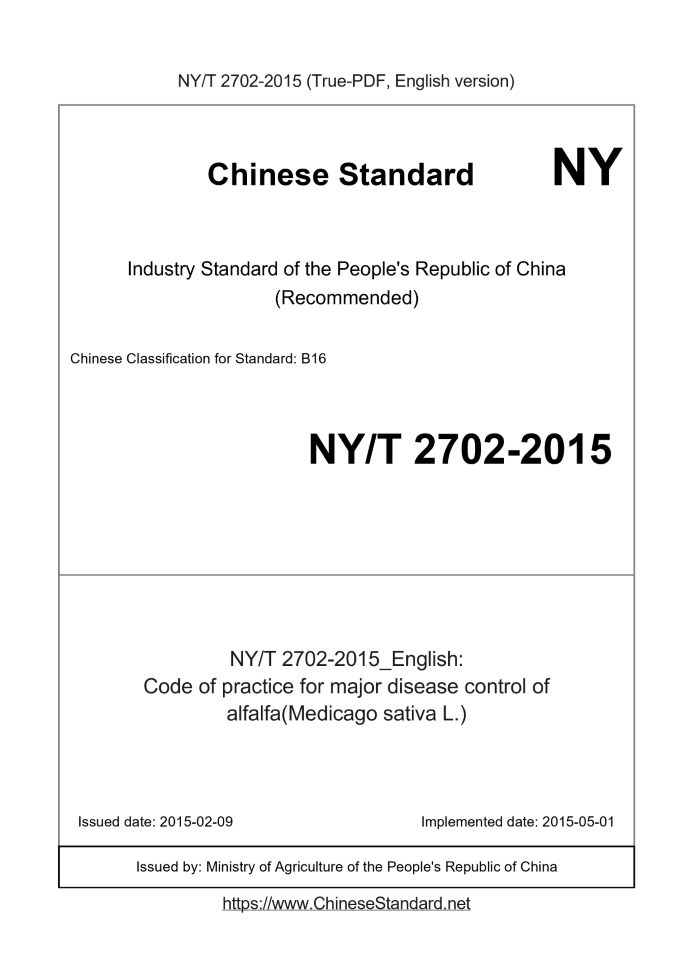 Delivery: <= 3 days. True-PDF full-copy in English will be manually translated and delivered via email. NY/T 2702-2015: Code of practice for major disease control of alfalfa(Medicago sativa L.) Status: Valid