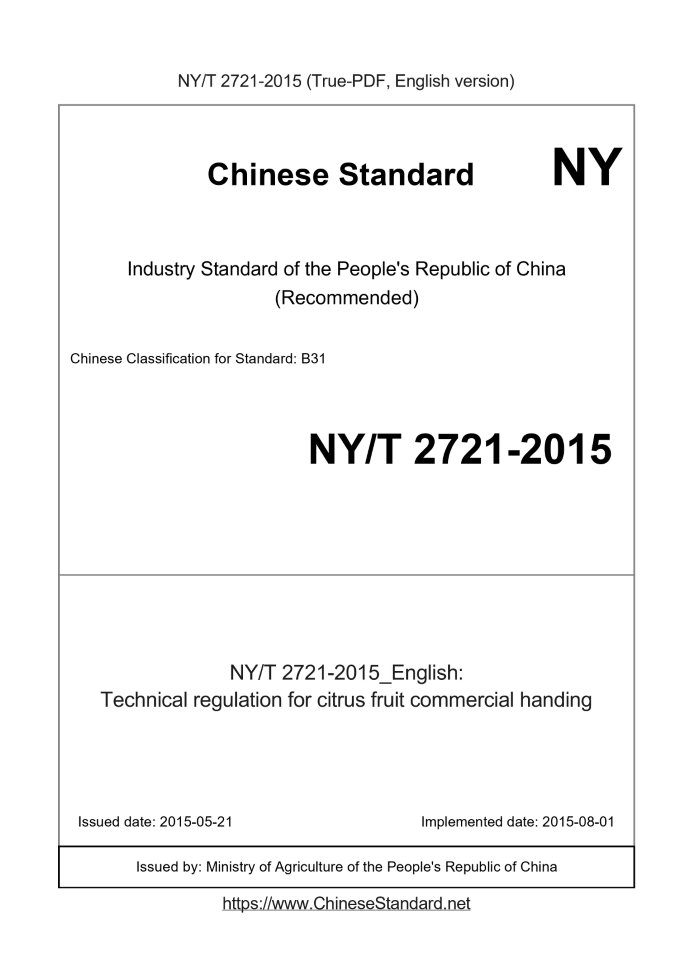 Delivery: <= 3 days. True-PDF full-copy in English will be manually translated and delivered via email. NY/T 2721-2015: Technical regulation for citrus fruit commercial handing Status: Valid