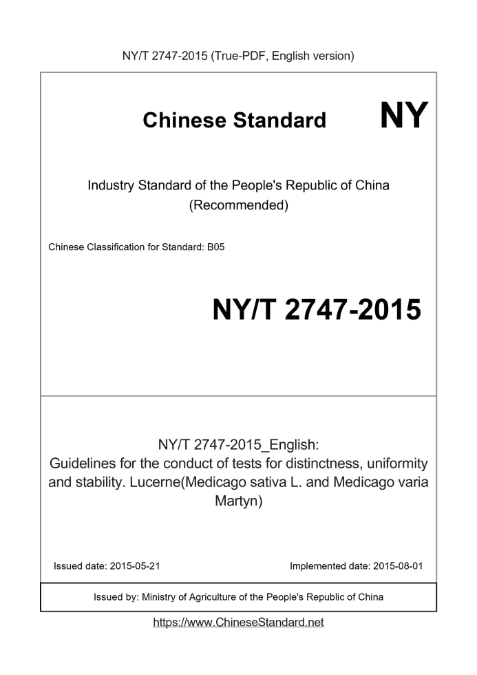 Delivery: <= 4 days. True-PDF full-copy in English will be manually translated and delivered via email. NY/T 2747-2015: Guidelines for the conduct of tests for distinctness, uniformity and stability. Lucerne(Medicago sativa L. and Medicago varia Martyn) Status: Valid