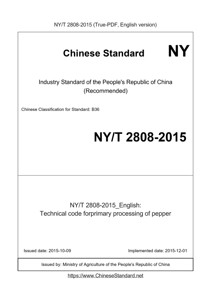 Delivery: <= 3 days. True-PDF full-copy in English will be manually translated and delivered via email. NY/T 2808-2015: Technical code forprimary processing of pepper Status: Valid