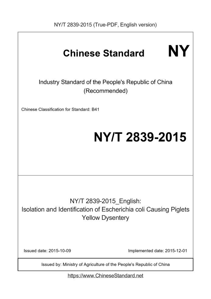 Delivery: <= 4 days. True-PDF full-copy in English will be manually translated and delivered via email. NY/T 2839-2015: Isolation and Identification of Escherichia coli Causing Piglets Yellow Dysentery Status: Valid