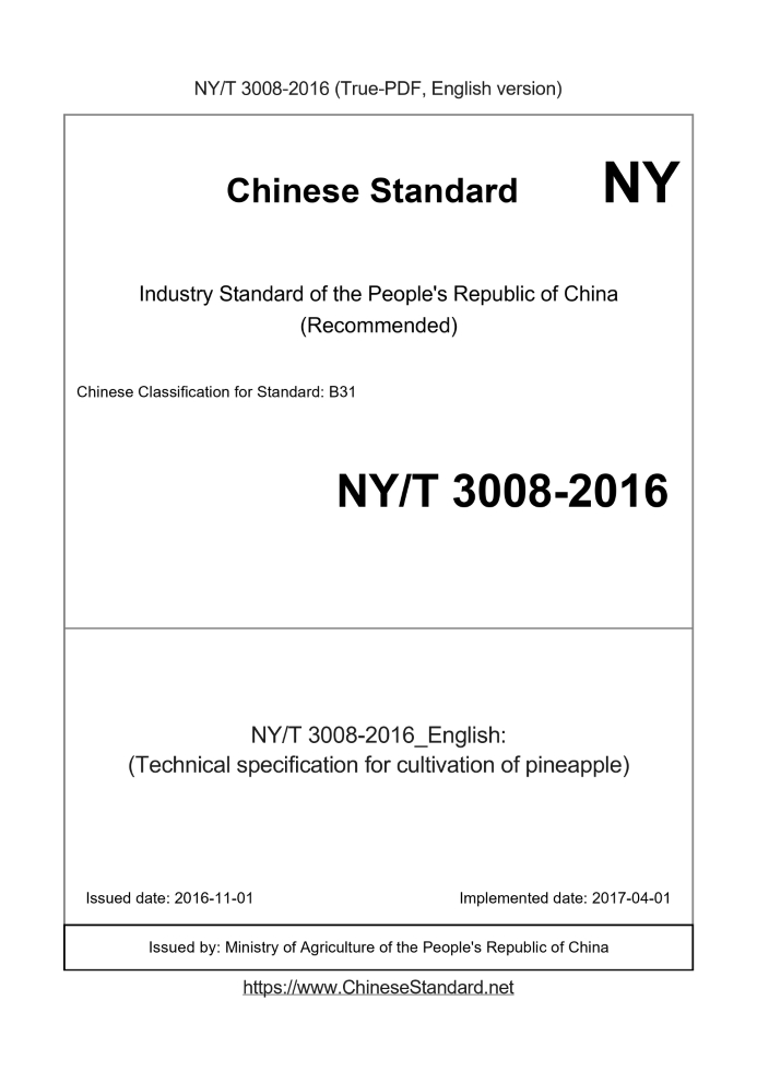 Delivery: <= 3 days. True-PDF full-copy in English will be manually translated and delivered via email. NY/T 3008-2016: (Technical specification for cultivation of pineapple) Status: Valid