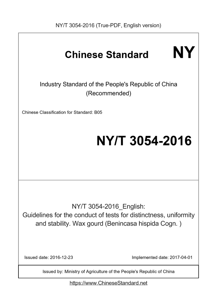 Delivery: <= 4 days. True-PDF full-copy in English will be manually translated and delivered via email. NY/T 3054-2016: Guidelines for the conduct of tests for distinctness, uniformity and stability. Wax gourd (Benincasa hispida Cogn. ) Status: Valid
