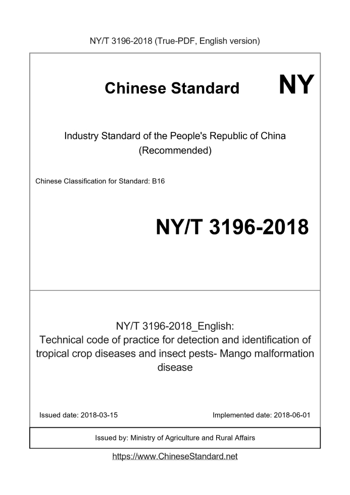 Delivery: <= 3 days. True-PDF full-copy in English will be manually translated and delivered via email. NY/T 3196-2018: Technical code of practice for detection and identification of tropical crop diseases and insect pests- Mango malformation disease Status: Valid