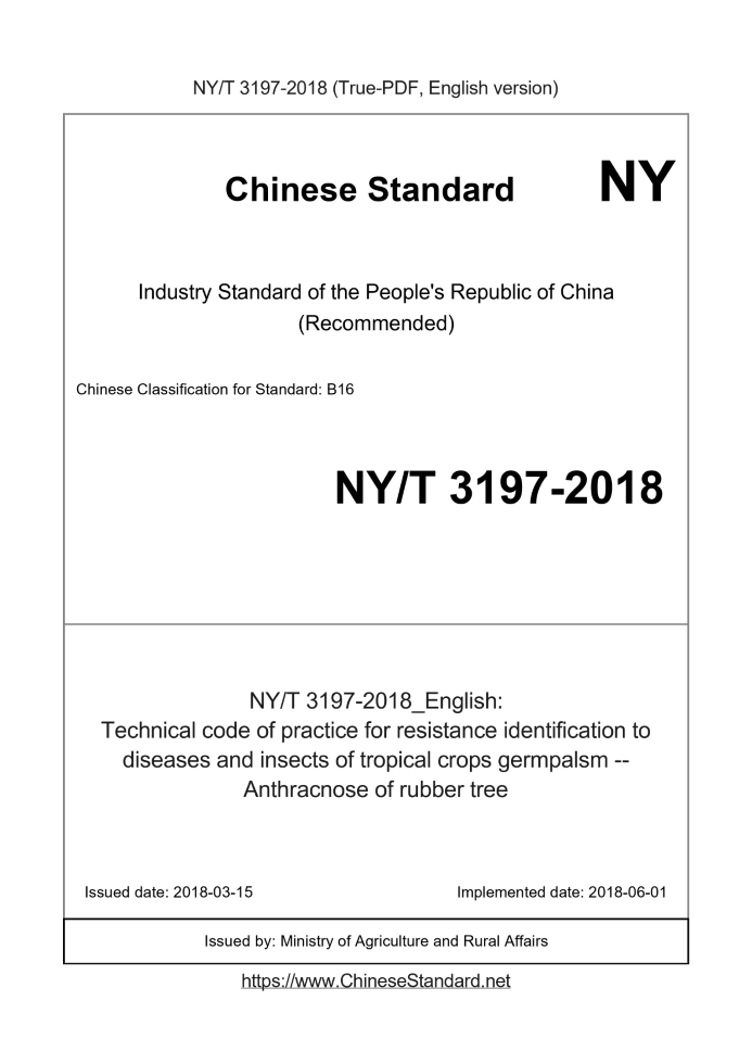 Delivery: <= 3 days. True-PDF full-copy in English will be manually translated and delivered via email. NY/T 3197-2018: Technical code of practice for resistance identification to diseases and insects of tropical crops germpalsm -- Anthracnose of rubber tree Status: Valid