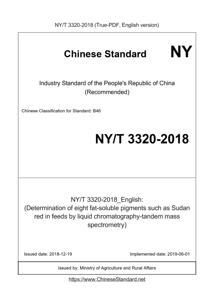 Delivery: <= 3 days. True-PDF full-copy in English will be manually translated and delivered via email. NY/T 3320-2018: (Determination of eight fat-soluble pigments such as Sudan red in feeds by liquid chromatography-tandem mass spectrometry) Status: Valid