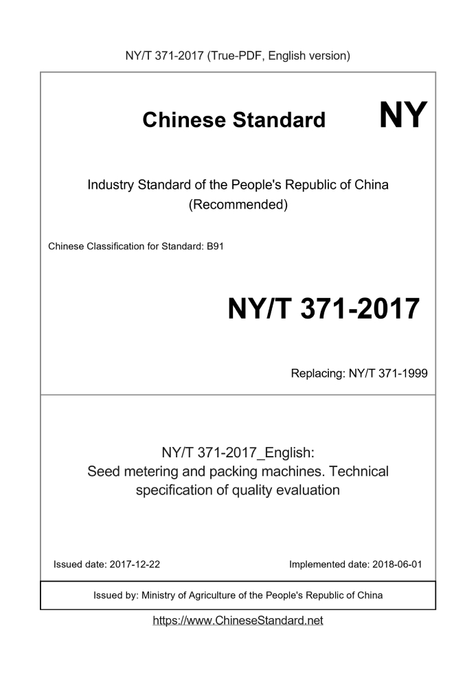 Delivery: <= 3 days. True-PDF full-copy in English will be manually translated and delivered via email. NY/T 371-2017: Seed metering and packing machines. Technical specification of quality evaluation Status: Valid NY/T 371: Historical versions