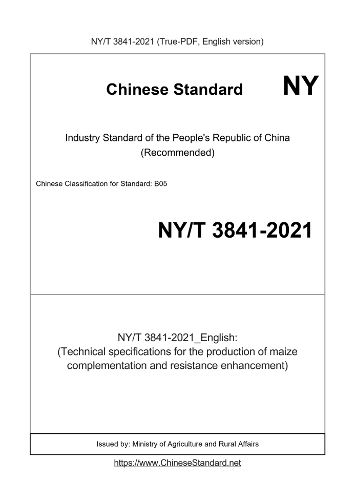Delivery: <= 3 days. True-PDF full-copy in English will be manually translated and delivered via email. NY/T 3841-2021: (Technical specifications for the production of maize complementation and resistance enhancement) Status: Valid
