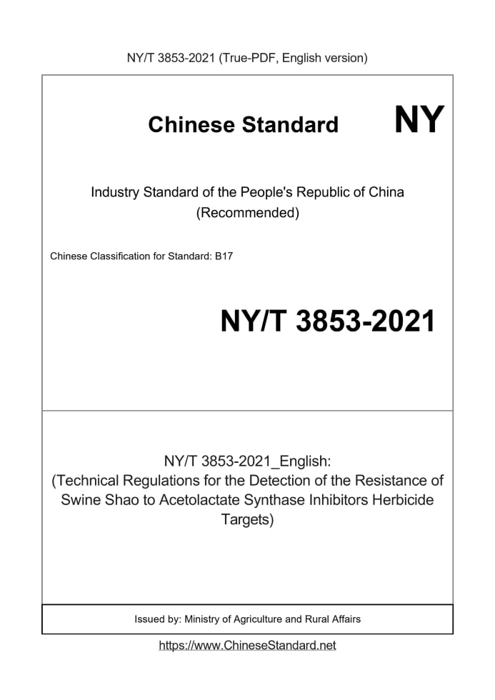Delivery: <= 3 days. True-PDF full-copy in English will be manually translated and delivered via email. NY/T 3853-2021: (Technical Regulations for the Detection of the Resistance of Swine Shao to Acetolactate Synthase Inhibitors Herbicide Targets) Status: Valid