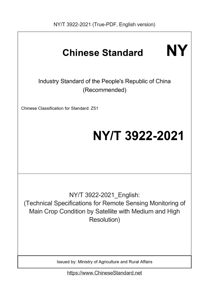 Delivery: <= 3 days. True-PDF full-copy in English will be manually translated and delivered via email. NY/T 3922-2021: (Technical Specifications for Remote Sensing Monitoring of Main Crop Condition by Satellite with Medium and High Resolution) Status: Valid