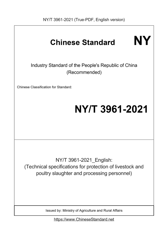 Delivery: <= 3 days. True-PDF full-copy in English will be manually translated and delivered via email. NY/T 3961-2021: (Technical specifications for protection of livestock and poultry slaughter and processing personnel) Status: Valid