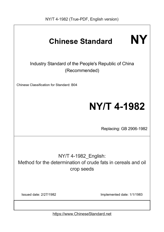 Delivery: <= 3 days. True-PDF full-copy in English will be manually translated and delivered via email. NY/T 4-1982: Method for the determination of crude fats in cereals and oil crop seeds