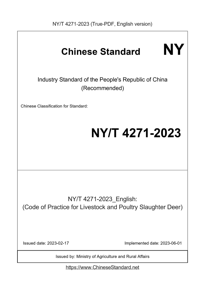 | NY/T 4271-2023 English PDFUS$199.00 ยท In stock Delivery: <= 3 days. True-PDF full-copy in English will be manually translated and delivered via email. NY/T 4271-2023: (Code of Practice for Livestock and Poultry Slaughter Deer) Status: Valid