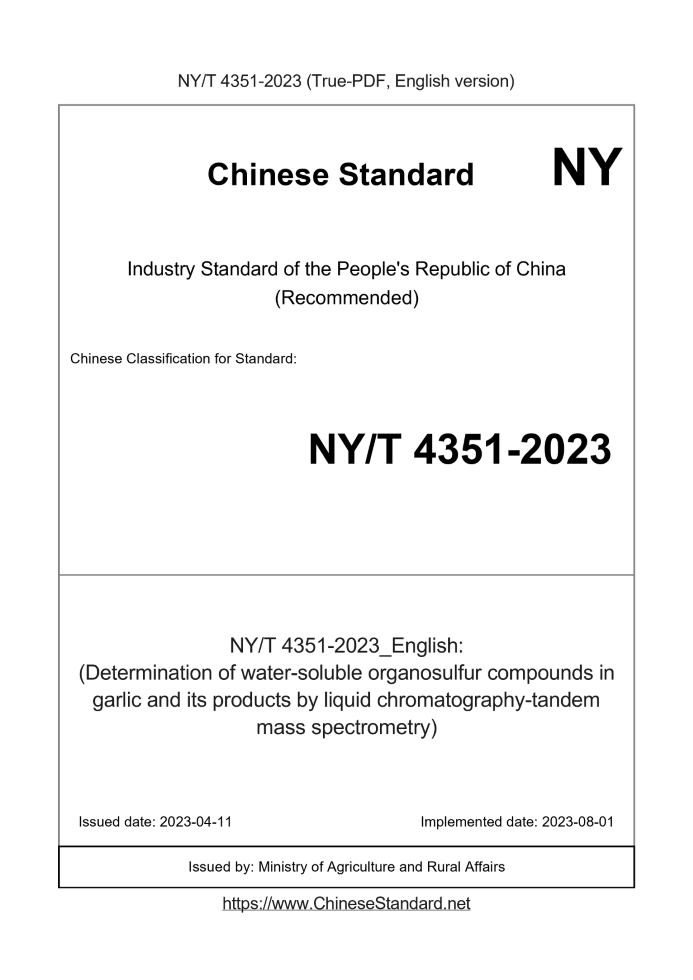 | NY/T 4351-2023 | English | RFQ | ASK | 3 days [Need to translate] | (Determination of water-soluble organosulfur compounds in garlic and its products by liquid chromatography-tandem mass spectrometry) |