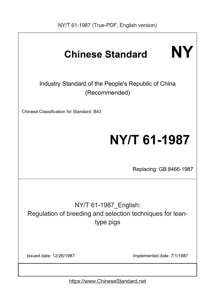 Delivery: <= 2 days. True-PDF full-copy in English will be manually translated and delivered via email. NY/T 61-1987: Regulation of breeding and selection techniques for lean-type pigs